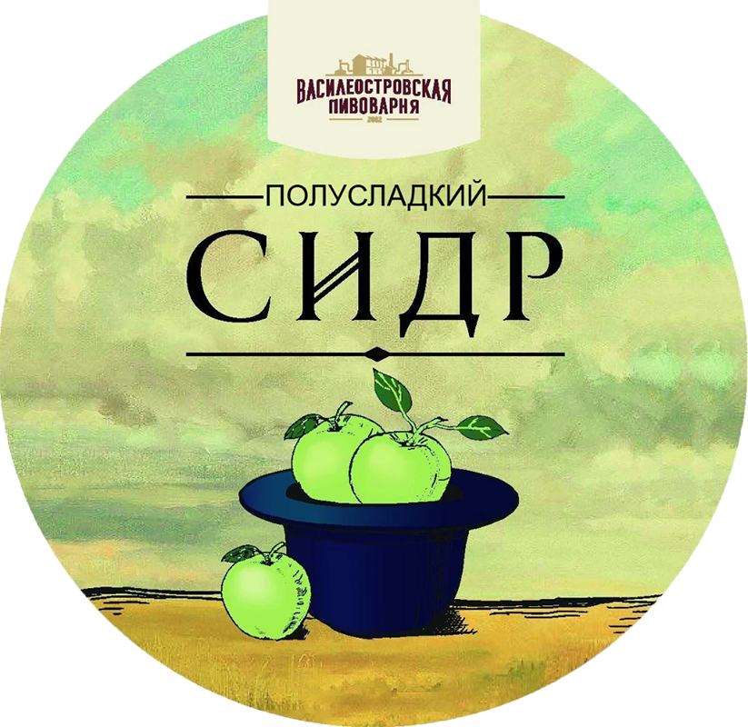 Василеостровская Пивоварня, Сидр полусладкий — сидр, созданный из сброженного сока спелых яблок. Он отличается приятным, соломенным цветом с зеленоватыми отблесками, свежим яблочным ароматом и насыщенным вкусом с продолжительным послевкусием. Полусладкий сидр составит отличную компанию десертам из сладких фруктов и запеченному с яблоками мясу птицы, также он прекрасно утоляет жажду и подается в виде самостоятельного напитка до или после трапезы.